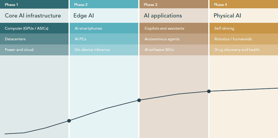 A useful way to frame this is the difference between beneficiaries and compounders, as defined by Coatue Management, a technology investment firm. Early in an adoption cycle, spending concentrates on infrastructure and enabling technologies. Revenue is closely tied to the build out of capacity, progress is visible, and earnings momentum can be strong. These businesses, known as beneficiaries, often lead markets early because their exposure is easy to explain and the numbers move quickly. The pattern broadly follows an S curve of technological adoption: first investment rises as capacity is built, then usage spreads across industries, and only later do productivity gains translate into sustainable profits. In the early phase value tends to accrue to suppliers of computer power, hardware, and tools, while the later phase shifts value towards businesses that embed the technology into workflows and capture recurring economic benefit.