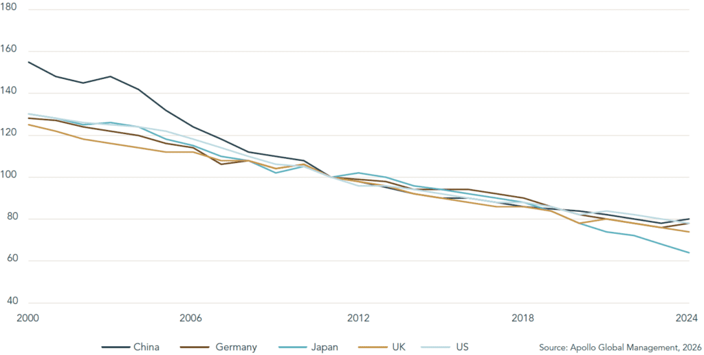 The scale of this growth impact is the subject of much debate. Historically, oil spikes of this magnitude have spelled trouble for the global economy. However, there are some mitigating factors in today’s situation. Not least, the chart above, which shows that major global economies are much less energy intensive than they used to be, which means they should be in a better position to cope with disruptions in energy supply. That is not to dismiss the potential impact by any means, but it limits the usefulness of historic parallels such as the Yom Kippur War (1973) or the Gulf War (1990–1991).