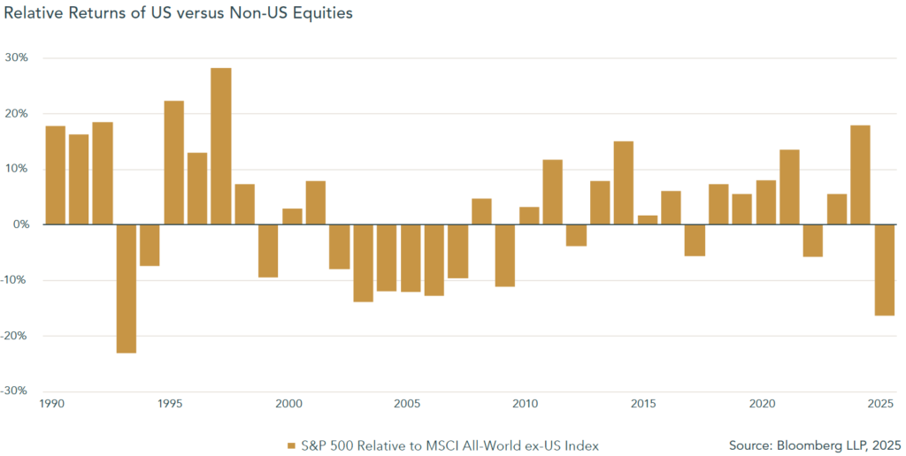 At the start of the year, there was a sense in equity markets that 2025 would be America’s year (again). With the return of President Trump, the US economy was expected to continue outpacing its developed market peers, supported by loose fiscal policy and corporate deregulation. Indeed, the US economy looks set to have grown faster than economists predicted at the start of the year. This is particularly impressive considering the slew of tariffs announced after Liberation Day in April, which were expected to derail growth at the time. The US equity market has also had a good year, with the S&P 500 Index returning an above average 18%, although it lagged the rest of the world which returned 33%. As shown below, it has been over a decade since we last saw such a strong relative year for equities outside the US.